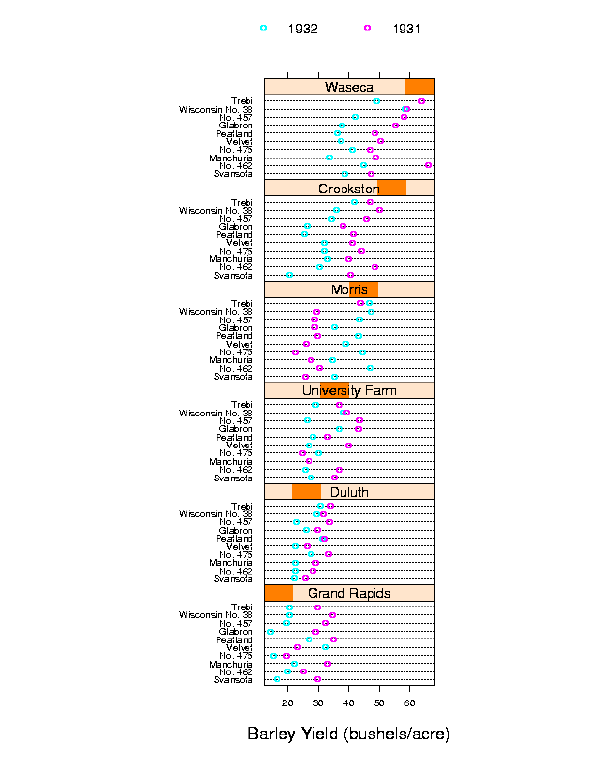 The following figure is a Trellis display of data from an agricultural field trial to study the crop barley. At six sites in Minnesota, ten varieties of barley were grown in each of two years. The data are the yields for all combinations of site, variety, and year, so there are 6 X 10 X 2 = 120 observations. Each panel in the figure displays the 20 yields at a single site.