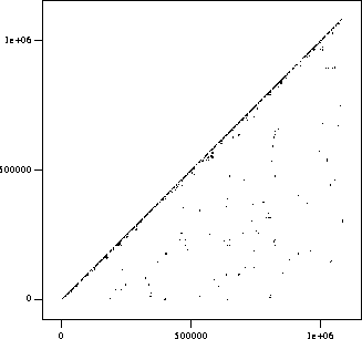 No line segments are plotted exactly on the main diagonal; the apparent density near the main diagonal indicates that there are many matches that are fairly local with respect to this amount of code, e.g. within the same file or module. However, the apparent density is misleading at this scale because the apparent density is greater than the actual density.