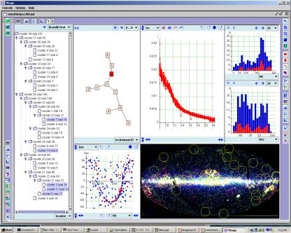 A fundamental concern in data analysis is to find correlations among different things. Mirage addresses this concern. Specifically, it offers graphical operations to track horizontal correlations across different attributes and views of the same objects and events, or vertical correlations among different levels of analysis. It also tries to bridge the gap between human and machine pattern recognition. (Themes in Mirage) Mirage is a Java-based software tool for exploratory analysis and visualization of images and numerical vectors from an arbitrary application domain. The tool shows projected images of points, point classes, or proximity structures in one, two, or higher dimensional subspaces, in linked views of tables, histograms, scatter plots, parallel coordinate plots, graphs, and trees, and over image or hypertext backgrounds. It also facilitates flexible plot configuration, manual or automatic classification, and intuitive graphical querying. Analysis and visualization operations are controlled by a small, interpreted command language. (Screenshots) |
